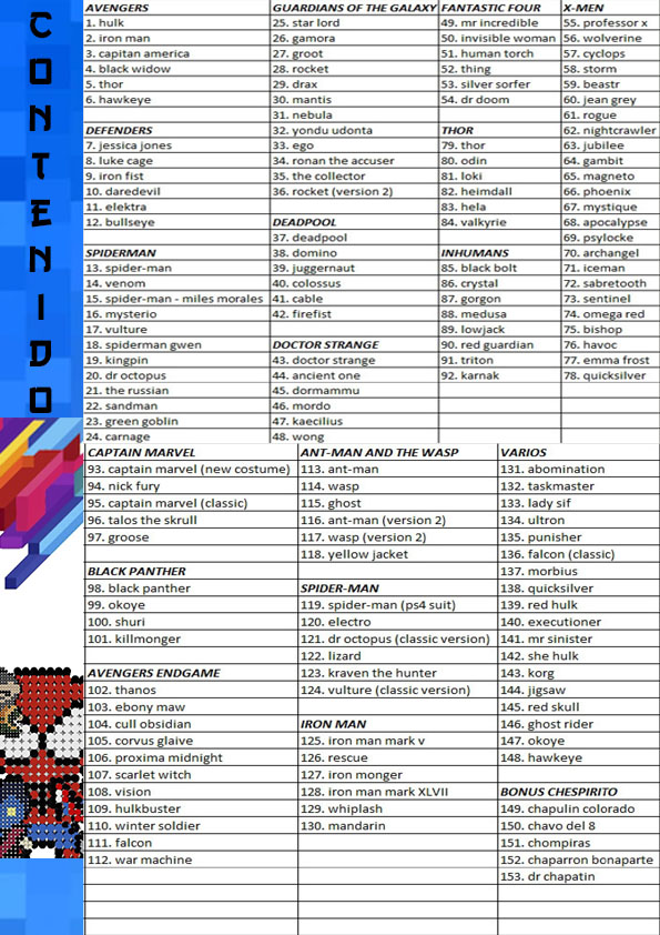 ¡No te pierdas esta increíble colección! Eleva tu habilidad artesanal con nuestro Catálogo Digital de Patrones de Hama Beads de Marvel y da vida a tus superhéroes y villanos favoritos en deslumbrantes figuras de beads.